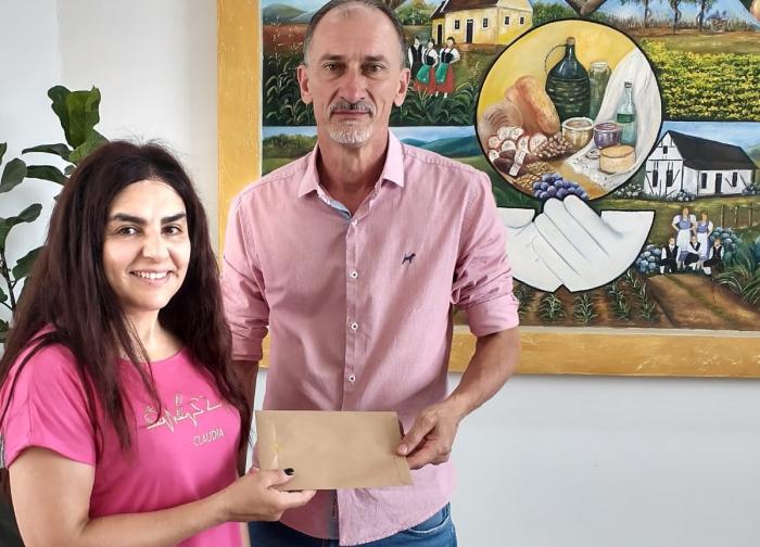 Cláudia Regina Ferreira, uma das ganhadoras do sorteio municipal do mês de dezembro recebendo seu prêmio pelas mãos do Prefeito em exercício, Gilberto João Zardin.