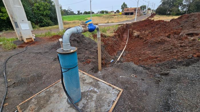Equipes da Secretaria de Obras trabalham na interligação do novo poço artesiano à tubulação geral da rede municipal. Este poço, perfurado neste ano, tem uma vazão de 12 mil litros por hora e vai reforçar significativamente o sistema de abastecimento.