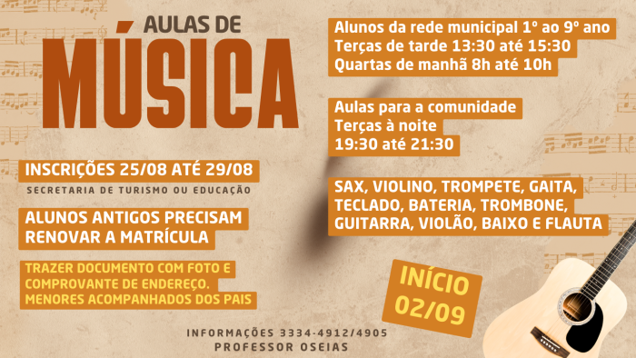 A Administração Municipal, por meio das Secretarias de Turismo e de Educação, informa que estão abertas as inscrições para as aulas de música no município, no período de 25 a 29 de agosto. Os interessados devem realizar a matrícula diretamente na Secretaria de Turismo ou na Secretaria de Educação.