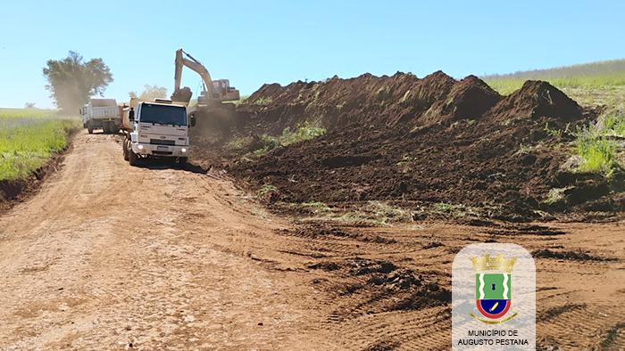 Outra frente de trabalho também está em andamento na localidade de Paraíso, onde está sendo realizado o cascalhamento e a compactação com o rolo compactador recentemente adquirido pela Administração Municipal, ampliando a qualidade e durabilidade das estradas.